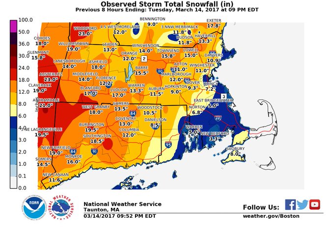 The highest snowfall amounts received so far in SNE were Granville at 21.5" and 20.0" in Huntington. Both locations in far western MA.